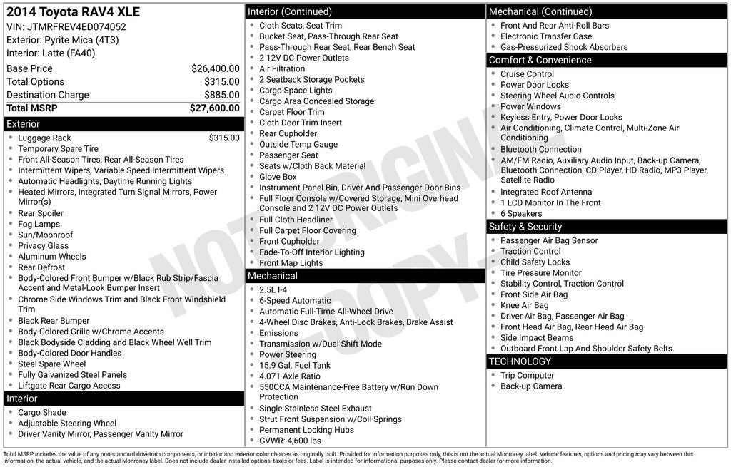 2014 Toyota RAV4 XLE AWD 2.5L 4-Cylinder DOHC Dual VVT-i 6-Speed Automatic 22/29 City/Highway MPG