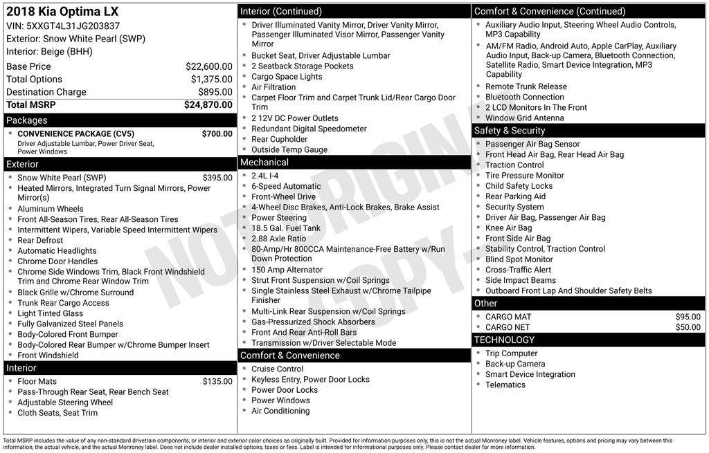 Whether you're commuting, running errands, or embarking on a road trip, this 2018 Kia Optima LX is ready to meet your needs. Schedule a test drive today and experience the perfect balance of style, technology, and performance that this Optima has to offer.
