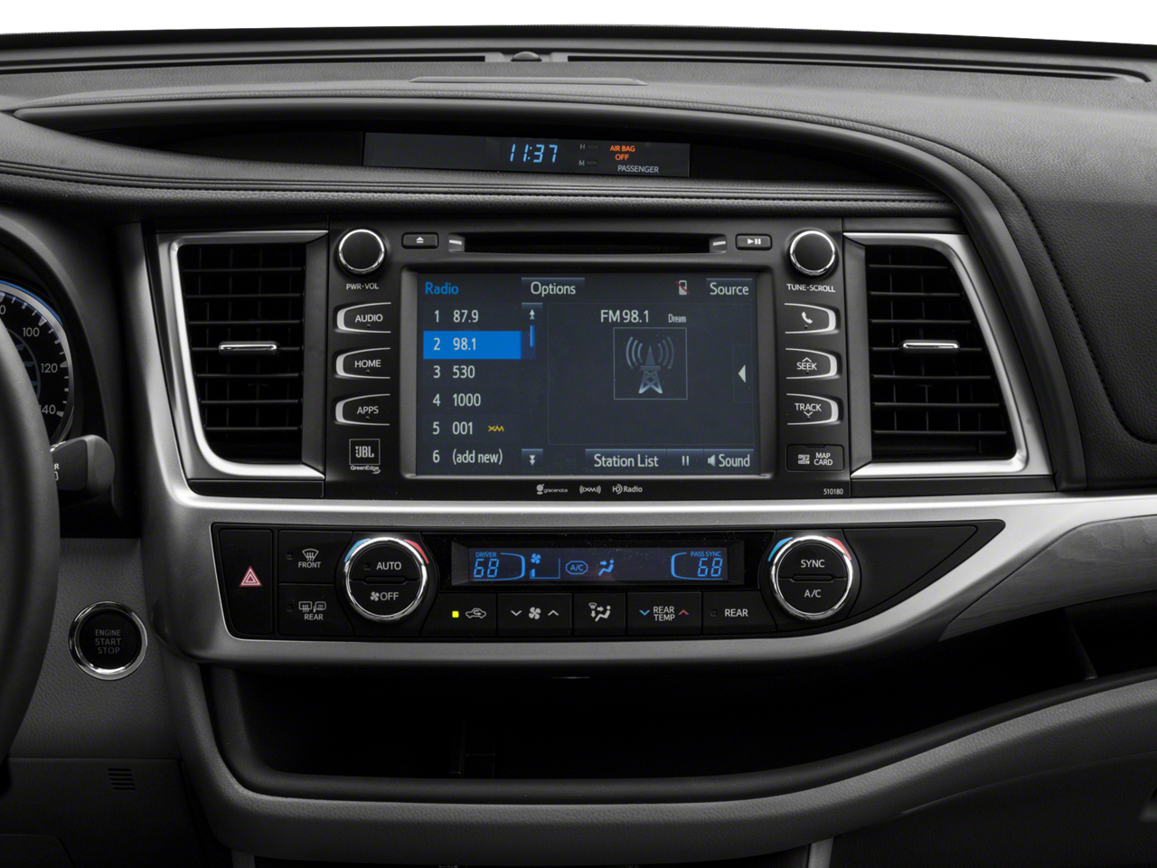 - Radio: Entune Premium JBL Audio w/Nav & App Suite -inc: the Entune Multimedia Bundle (8" high resolution touch-screen w/split screen display, AM/FM CD player, MP3/WMA playback capability, 12 JBL GreenEdge speakers, auxiliary audio jack, USB 2.0 port w/iPod connectivity and control, advanced voice recognition, hands-free phone capability, phone book access and music streaming via Bluetooth® wireless technology), Siri Eyes Free, Entune App Suite, Intelligent Touch controls, SiriusXM Satellite Radio w/3-month complimentary SiriusXM All Access trial, HD Radio, HD Radio predictive traffic and Doppler weather overlay, AM/FM cache radio, Gracenotes album cover art and integrated backup camera display w/dynamic gridlines