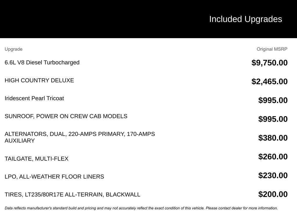 - Tire, spare LT275/70R18 all-terrain, blackwall (Included and only available with (QF9) LT275/65R20 all-terrain, blackwall tires on single rear wheel models.)
