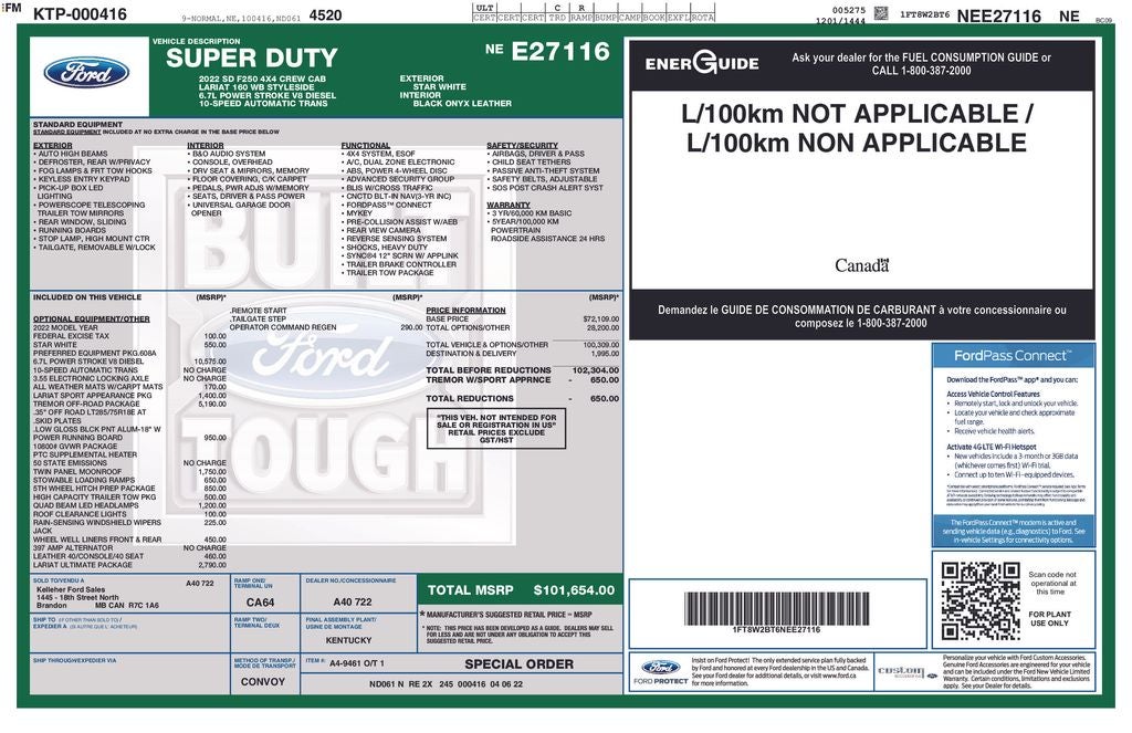 This F-250SD Lariat is equipped with a powerful Power Stroke 6.7L V8 DI 32V OHV Turbodiesel engine, mated to a smooth-shifting 10-Speed Automatic transmission, delivering the performance and towing capacity you demand. With its 4WD system, this truck is ready to tackle any terrain, whether you're hauling heavy loads or venturing off the beaten path.