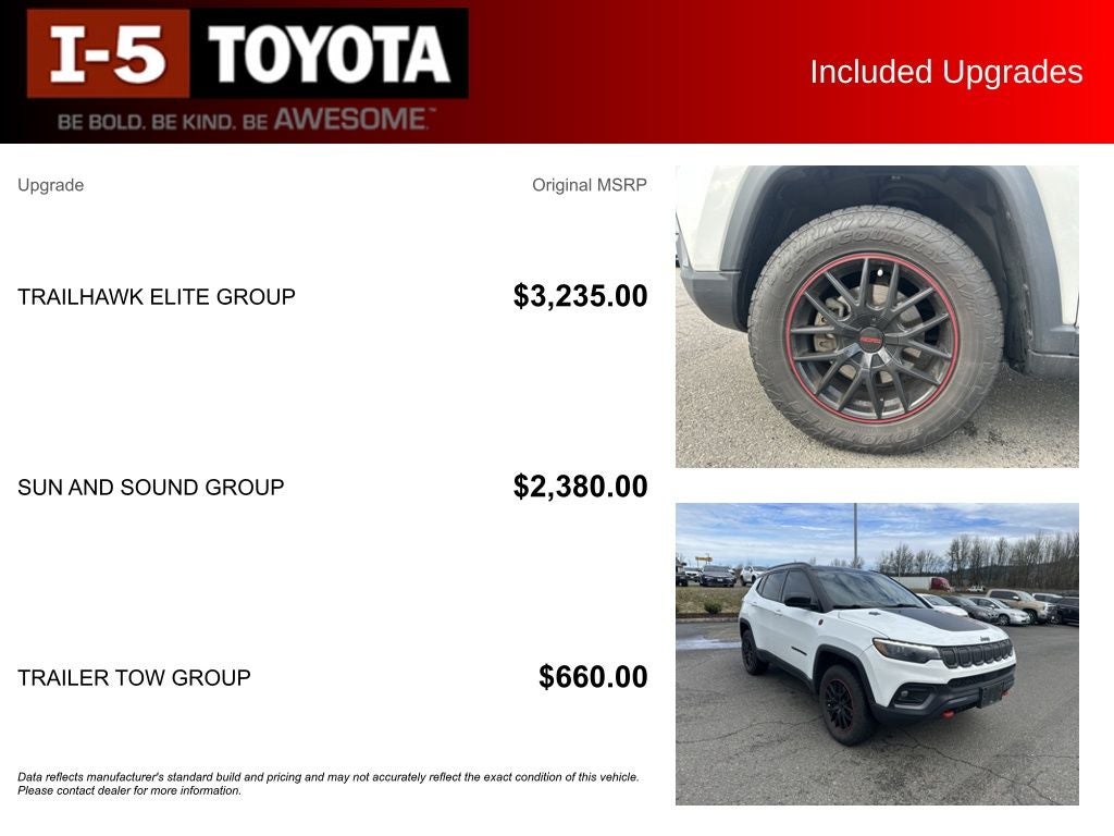 Whether you're exploring the great outdoors or navigating the daily commute, this 2022 Jeep Compass Trailhawk is ready to elevate your driving experience. Schedule a test drive today and discover the true potential of this exceptional SUV.