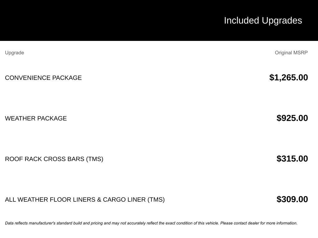 - CONVENIENCE PACKAGE: Front Door Smart Key System w/Push Button Start, remote keyless entry and power liftgate w/jam protection, Tilt & Slide Moon Roof